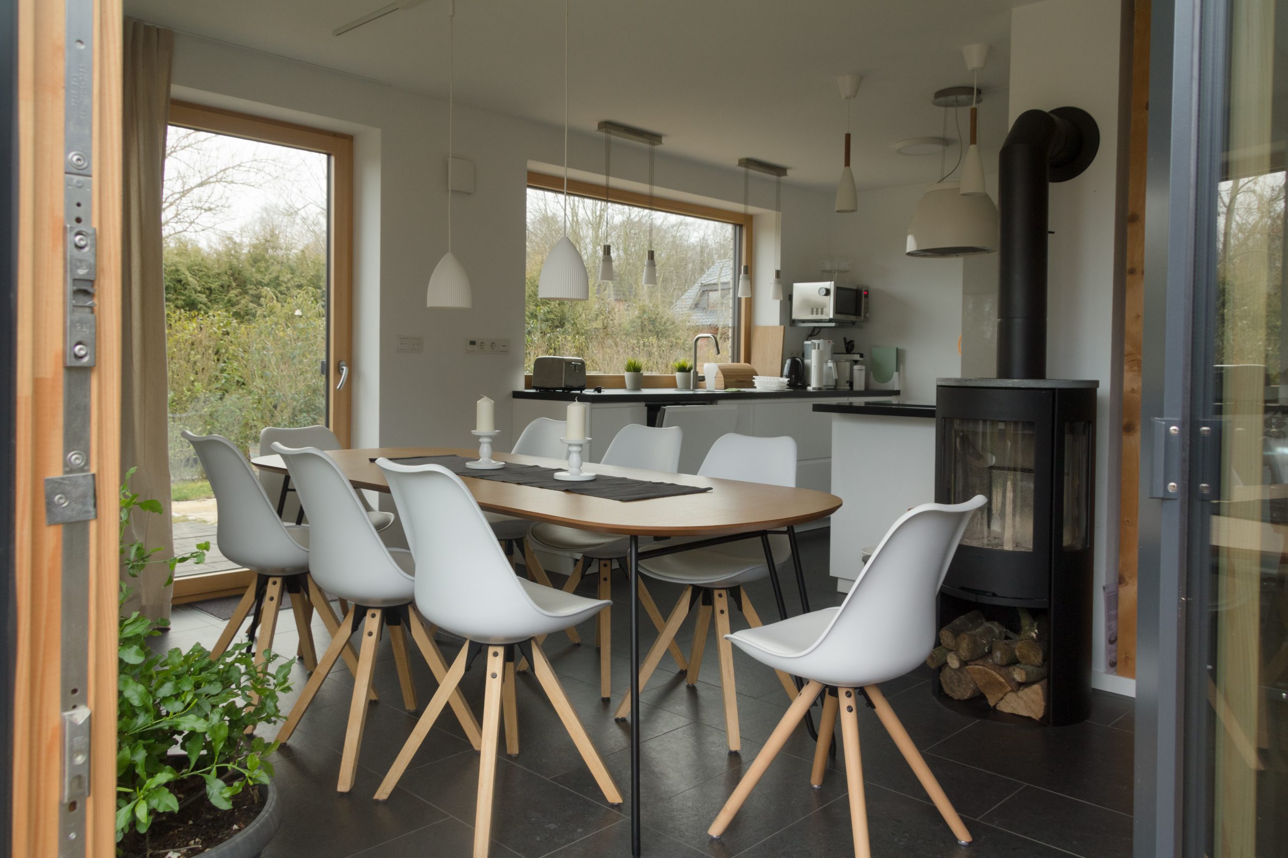 Schleiharmonie[1] liegt in Ulsnis an einer ruhigen Seitenstraße, die direkt zur Schlei führt mit Badestrand und Bootssteg. Mit seiner luxuriösen Ausstattung von 4 Schlafzimmern, 2 Wohnzimmern, 3 Bädern, Kaminofen, 2 Terrassen und Garten bietet das Haus 8 Personen großzügig Platz für einen erholsamen Urlaub. Von dem Licht durchfluteten großen Wohn-Essraum (41 qm) gelangt man auf die Terrassen mit Esstisch für 8 Personen, Strandkorb, Sonnenliegen und Holzkohle-Grill (Weber). Die Küche im EG lässt keine Wünsche offen. Ihr Elektrofahrzeug können Sie auf dem Parkplatz vor dem Haus laden.